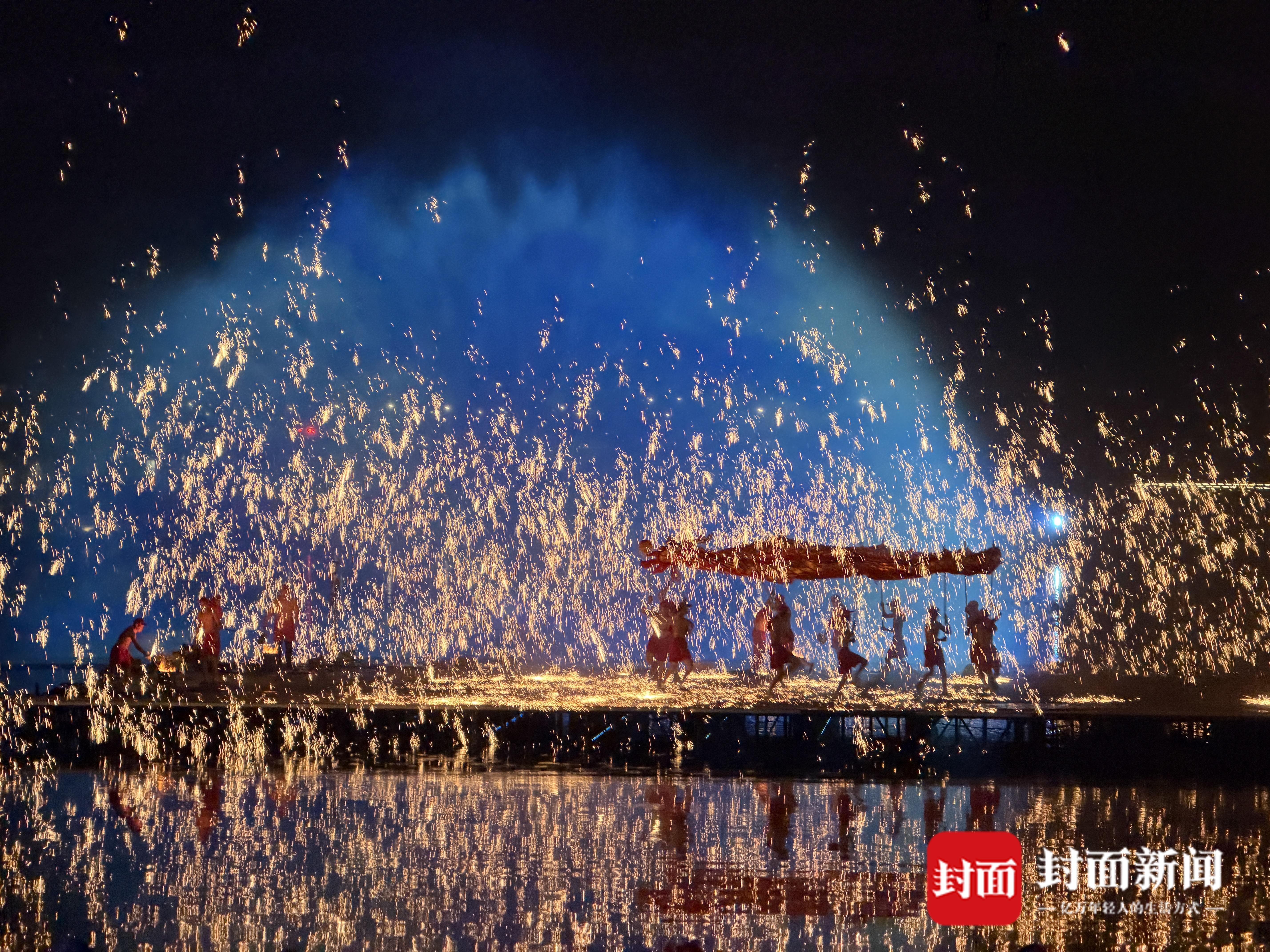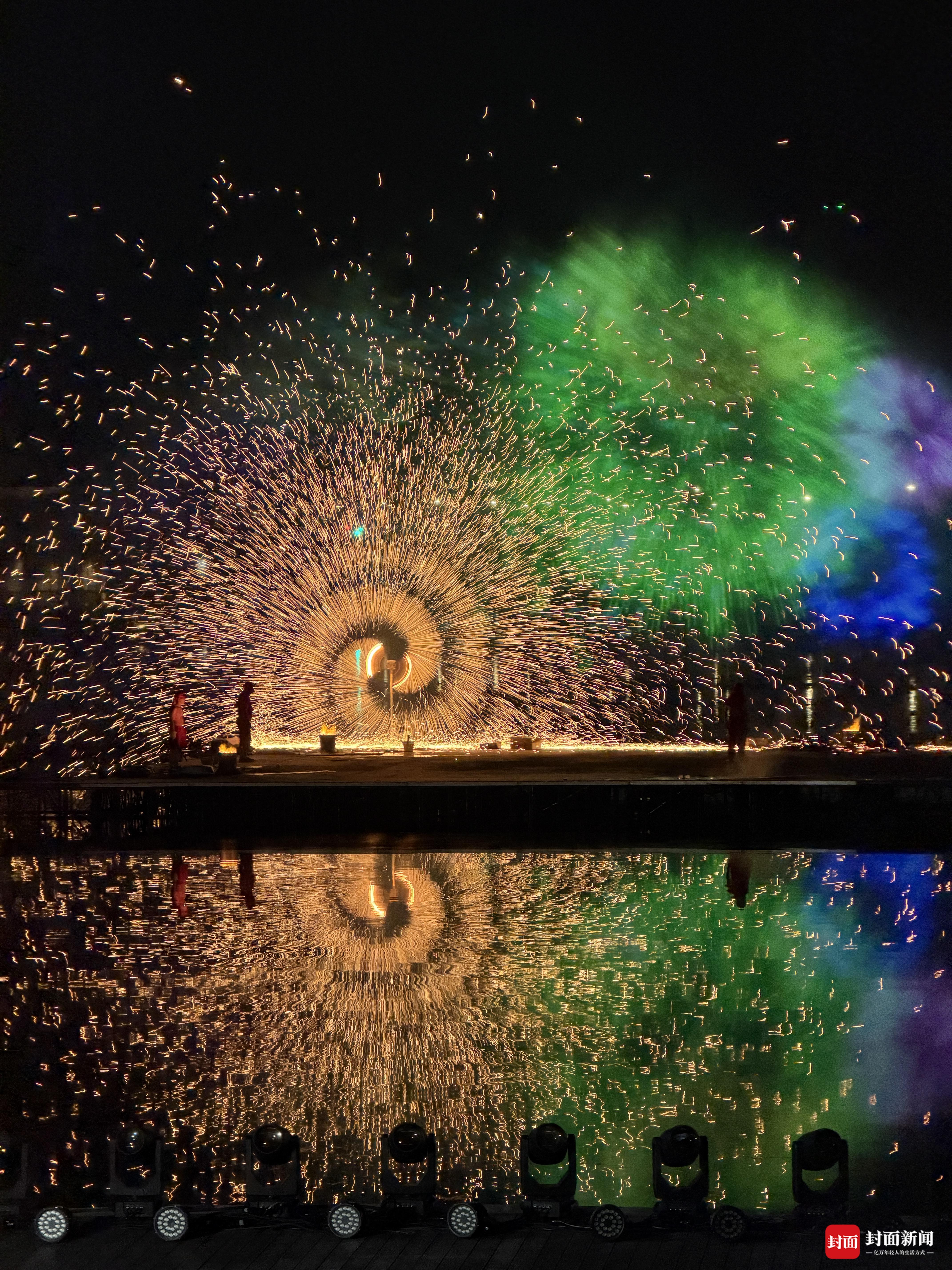 在主展馆旁的湖中,水幕光影秀同步上演,水幕、灯光、音乐交织,再配上精彩的打铁花,过年氛围感直接拉满。