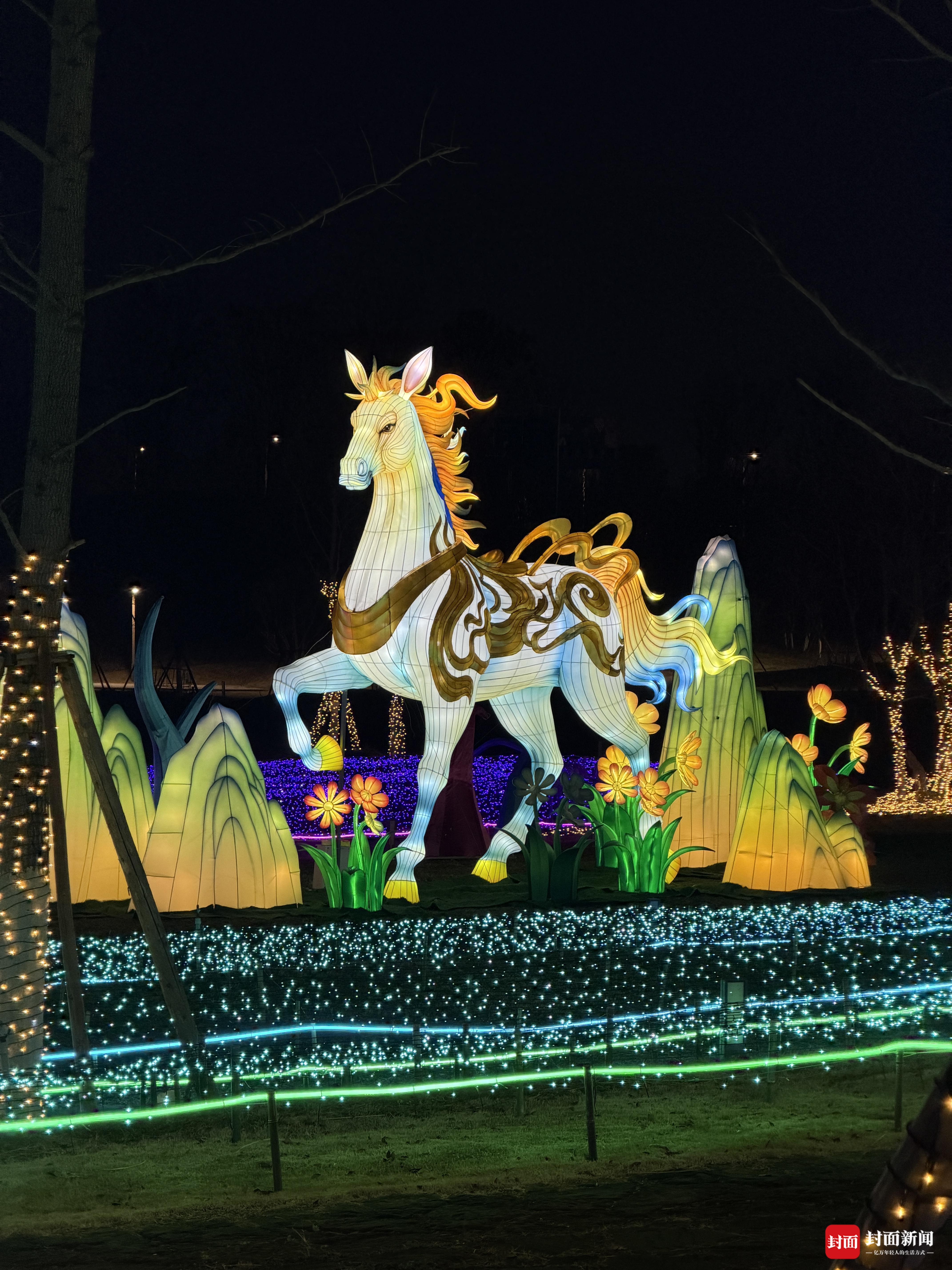 一进园区,红灯笼沿路排开,金色的麦浪灯高低错落,让人仿佛置身丰收的麦田。旁边,一匹骏马灯组昂首抬蹄,鬃毛与尾羽以渐变的黄、蓝、金三色呈现,仿佛在风中飞扬,动态感十足。