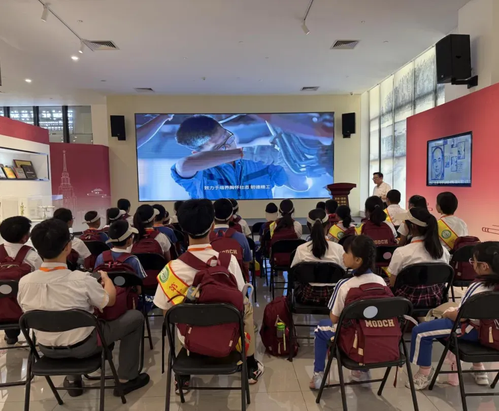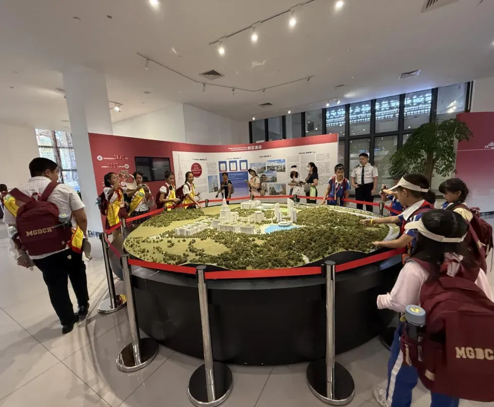 在工作人员的带领下,孩子们走进了校史馆,整齐地坐在教室里,认真看着深圳北理莫斯科大学的校史视频。他们好奇地俯身观看校史馆里的每一个展品,惊叹于深圳速度与莫斯科学术深厚底蕴的完美结合。