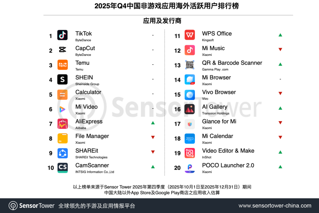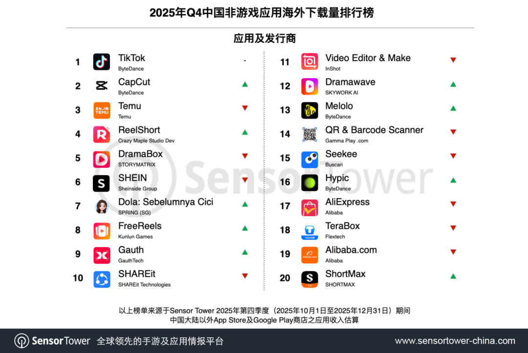 DoNews1月14日消息,Sensor Tower 最新数据显示,2025年第四季度(10月1日至12月31日,下称 “Q4”),非游戏移动应用在全球市场迎来强劲收官。字节跳动旗下 TikTok 与 CapCut 强势包揽非游戏出海收入榜、下载榜与 MAU 榜的冠亚军席位,成为本季度最具代表性的全球化应用组合。